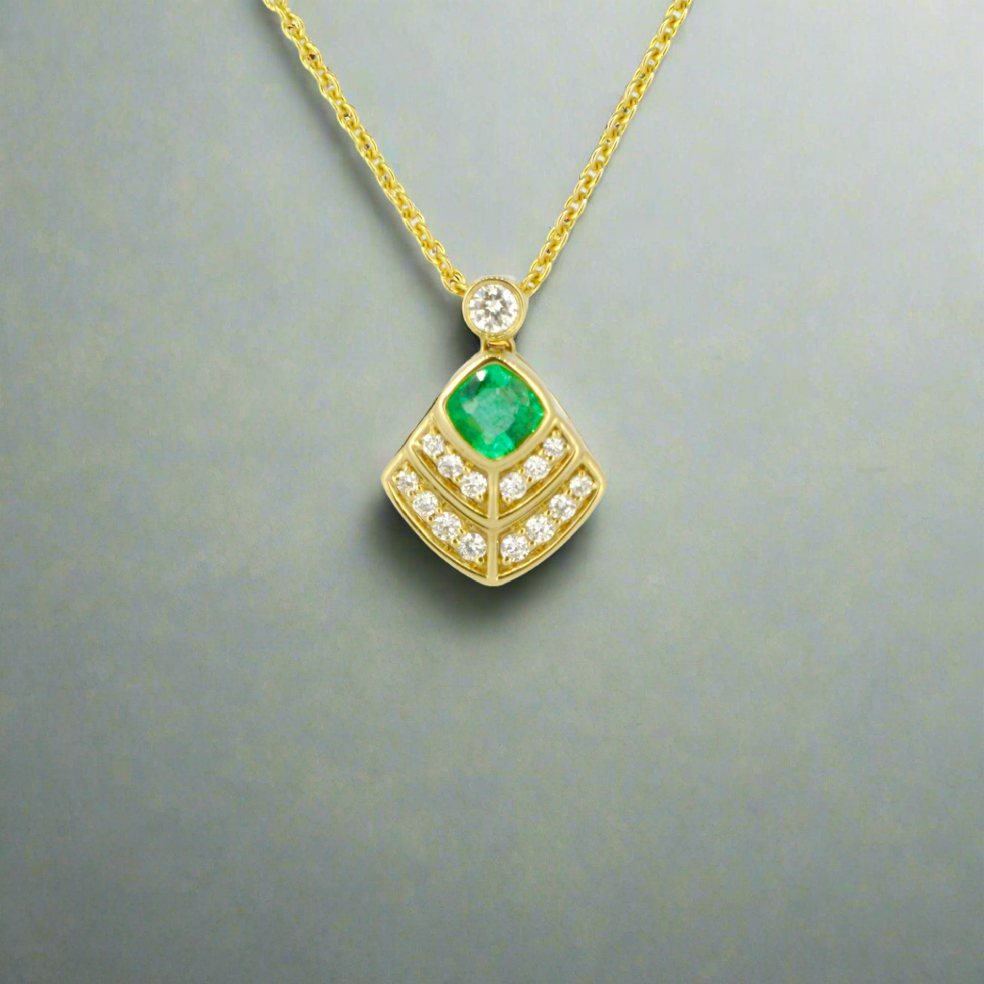 18ct yellow gold necklace, adorned with a 0.17ct Emerald and 30pts of diamonds