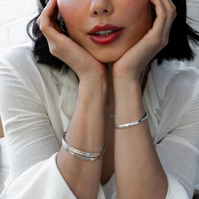 'Handcrafted in our London studio, this sterling silver 6mm hollow hinged bangle has an easy-to-use clasp and is complete with our signature hammered finish. Wear alone or stack up with multiple bracelets and bangles for elevated style.'