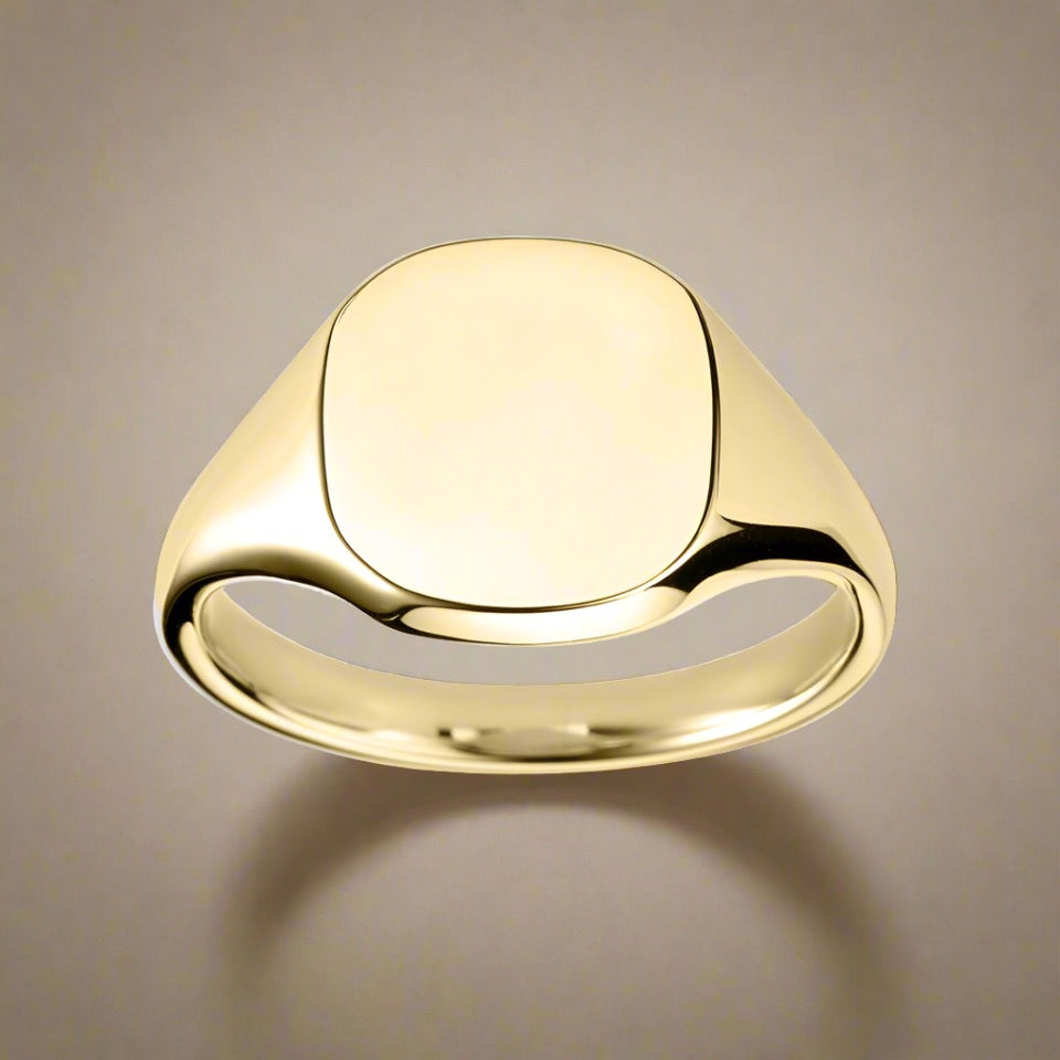 Make a statement with this classic yet modern solid 9ct yellow gold signet ring. The ring features a substantial rectangular surface that provides an ideal canvas for engraving initials, a family crest, or other personalised insignia. The polished high-shine finish accentuates the rich golden hue.