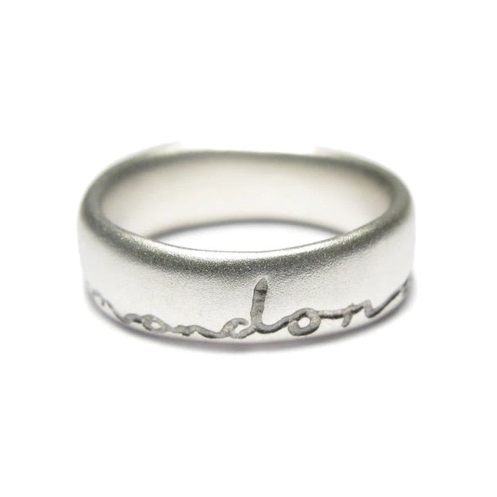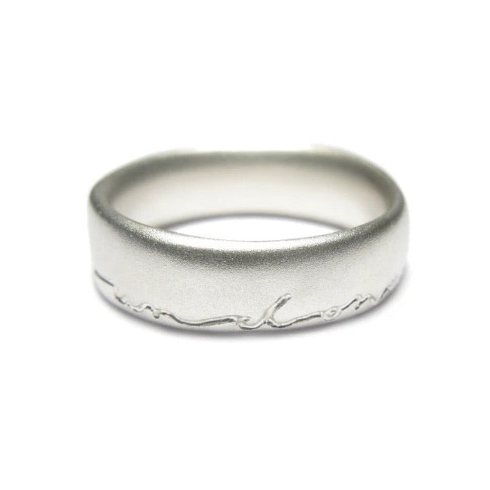 A silver mid width band, etched around the outside in lowercase lettering 'on and on.' The etching can be chosen in all silver, oxidised finish or highlighted in 22ct yellow gold