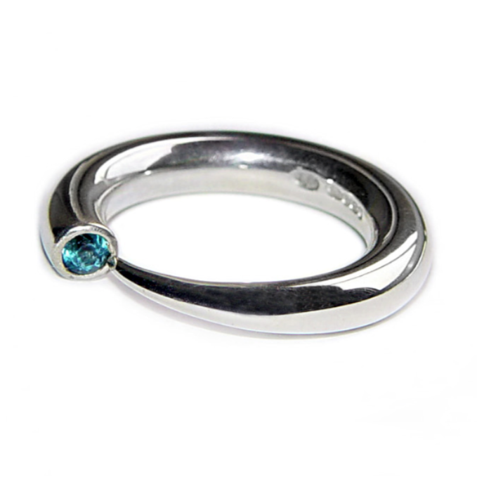 Silver. Hand forged silver tapering contemporary ring with a comfortable rounded band. The solid sterling silver band tapers to a point from 4mm and is end set with a 3mm faceted gemstone. The ring is one of the original designs in Paul’s timeless classic ”wiggly” collection.