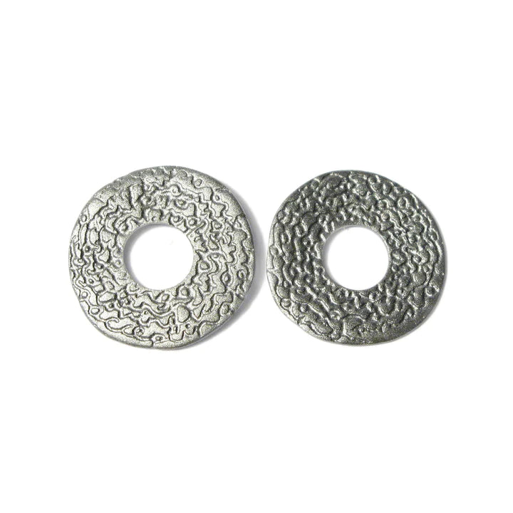 Silver etched disc earrings. One disc is etched with Dianas 'being' words and one is etched with 'on and on' both in lowercase handwriting. These earrings are available in silver, oxidised finish or the etching can be highlighted in 22ct yellow gold. Shown here in oxidised silver finish