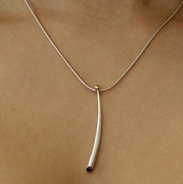 Long curved wiggly pendant with blue topaz & 18ct gold bead.