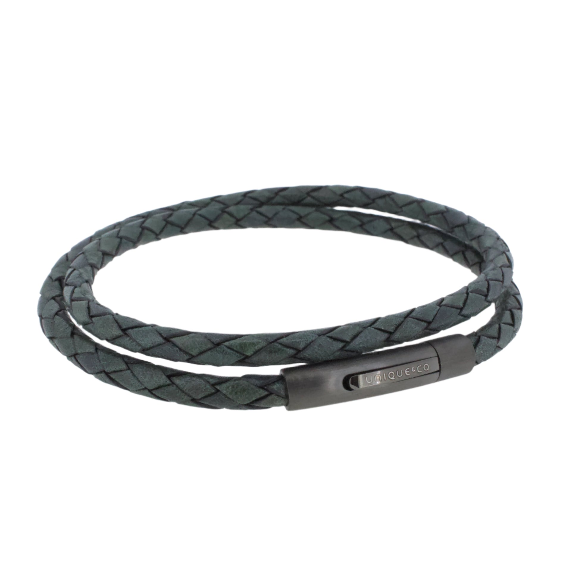 Woven leather with a gunmetal stainless steel clasp