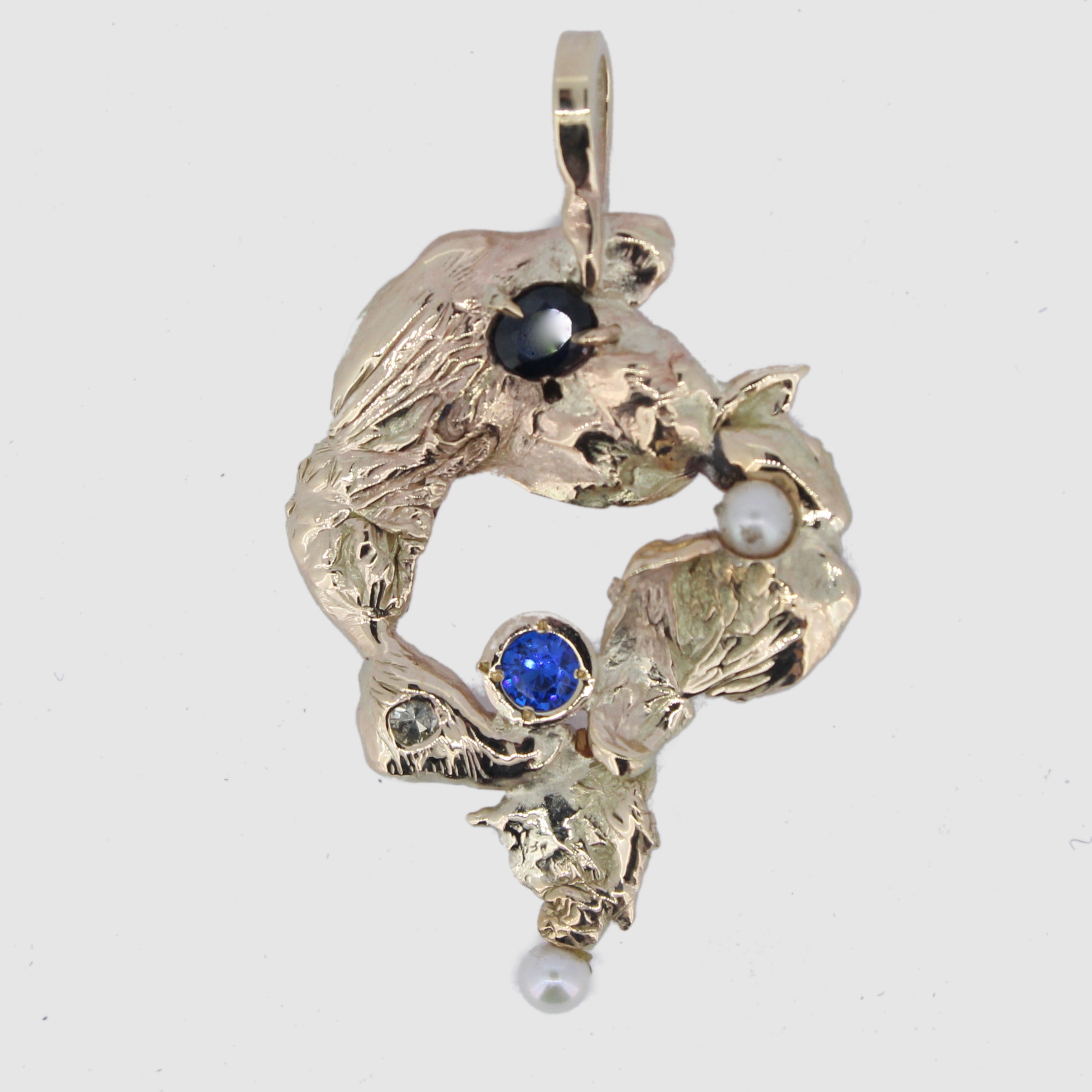 Remodelled from client's family jewellery. Created through water casting, adorned with sapphires, diamonds and pearls