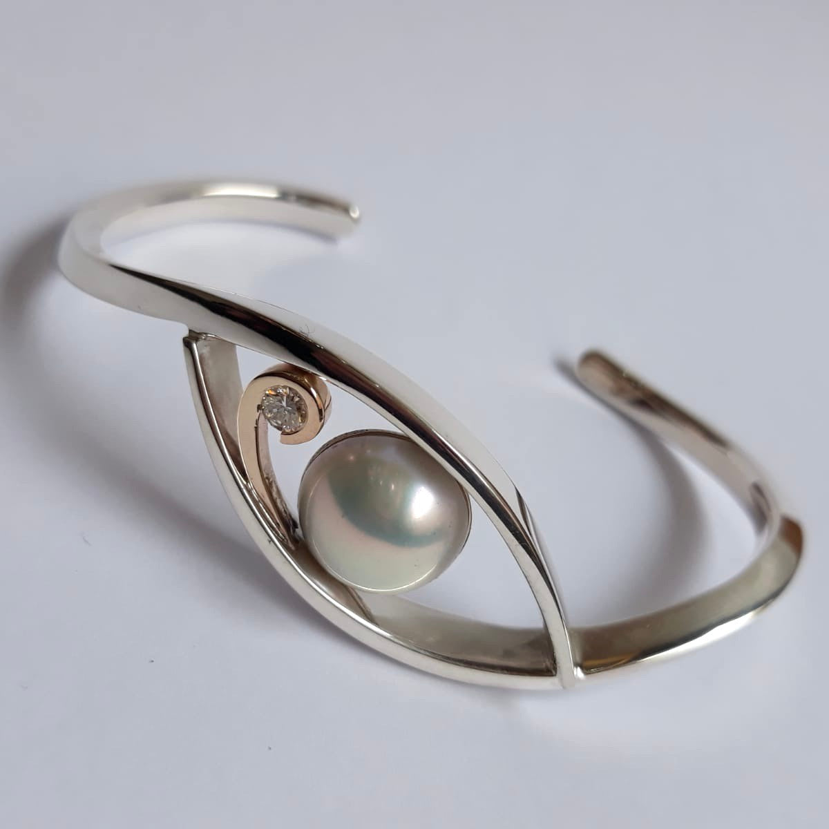 A beautiful handcrafted silver torque bangle featuring the customers own diamond and a pearl.