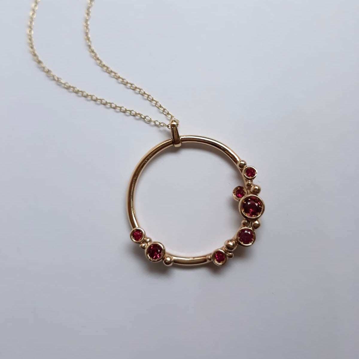 A stunning round gold pendant set with a variety of sized garnets and a gold chain.