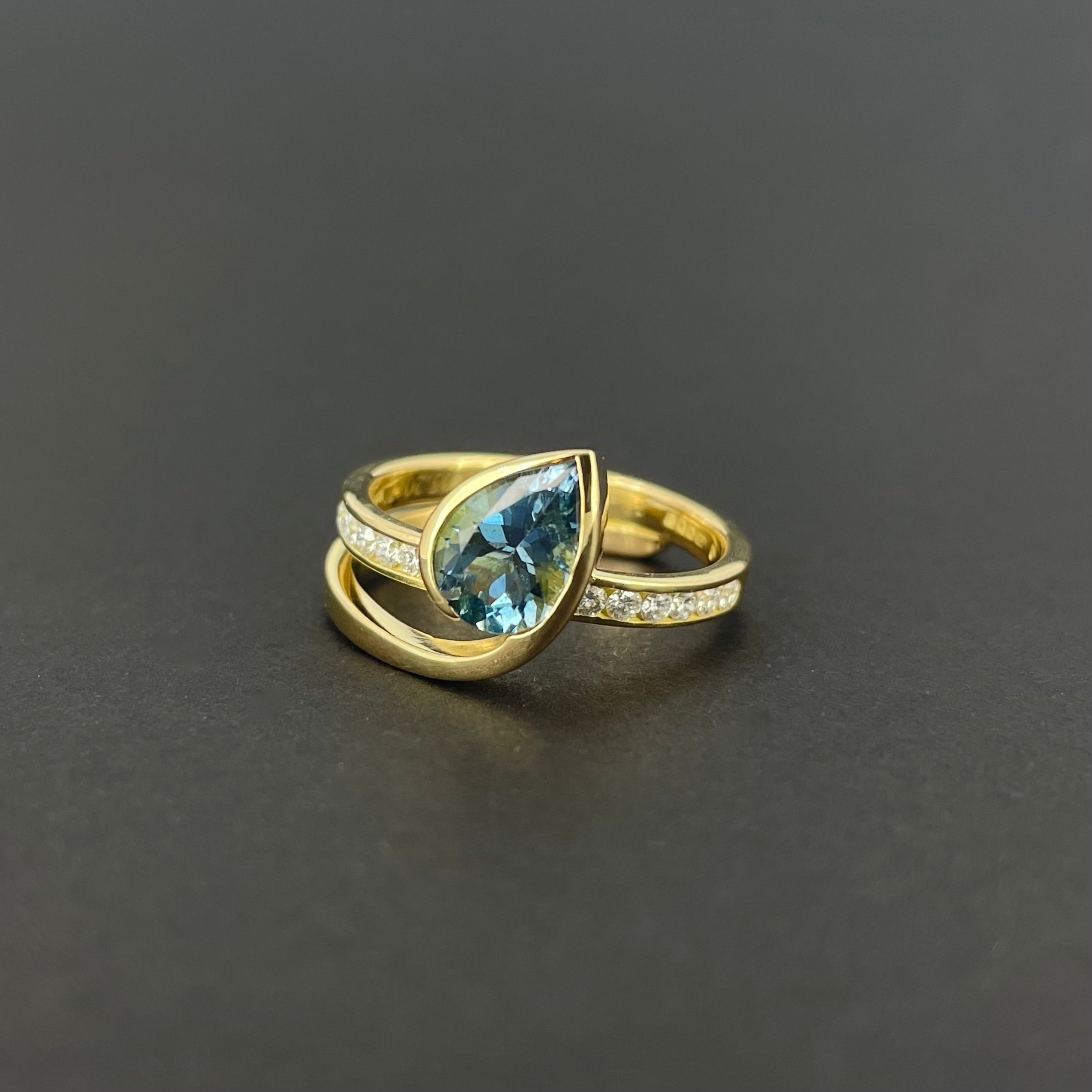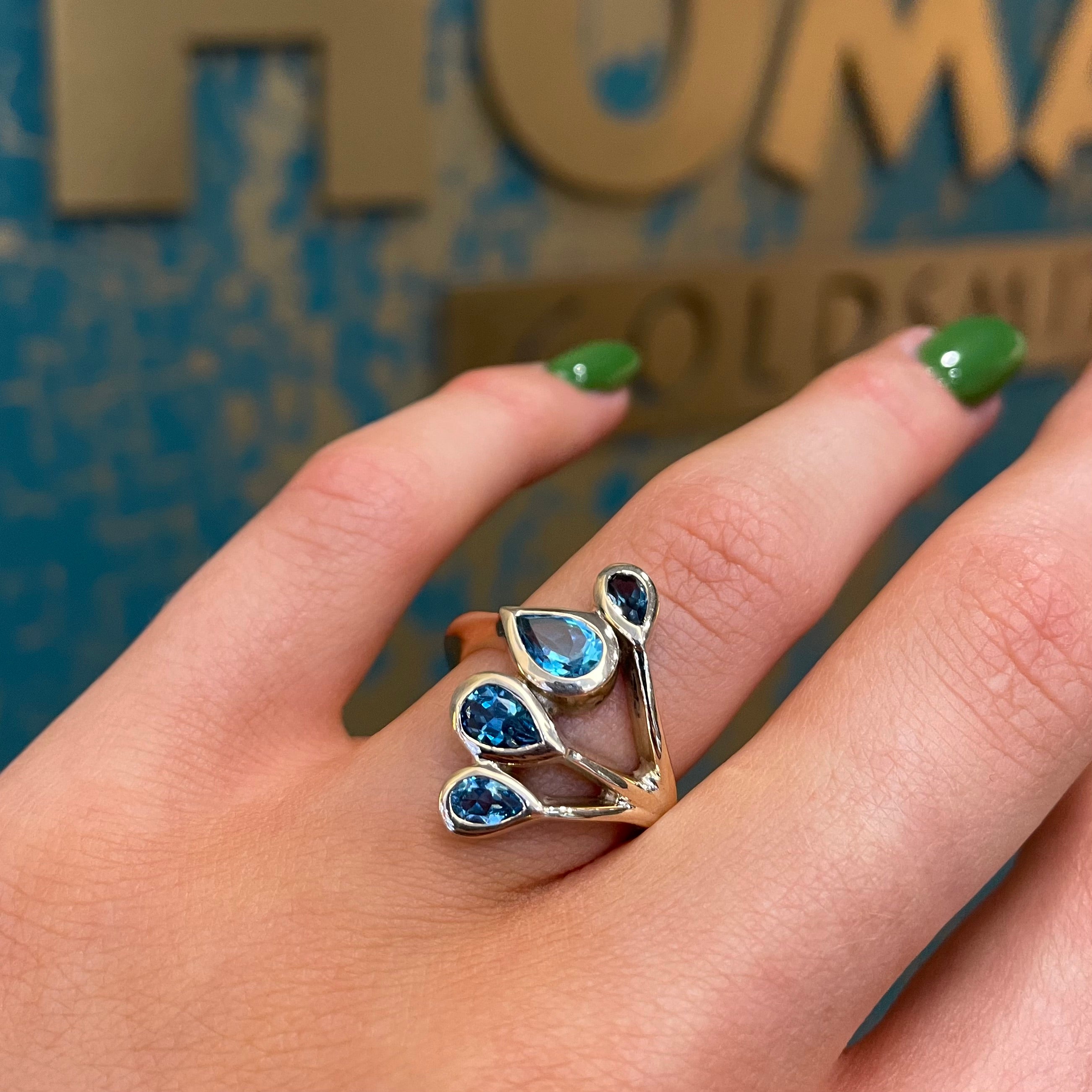 Pear cut Swiss, London and Sky blue topaz set in 9ct gold. This was hand crafted to tie in with a previously made bespoke commission.