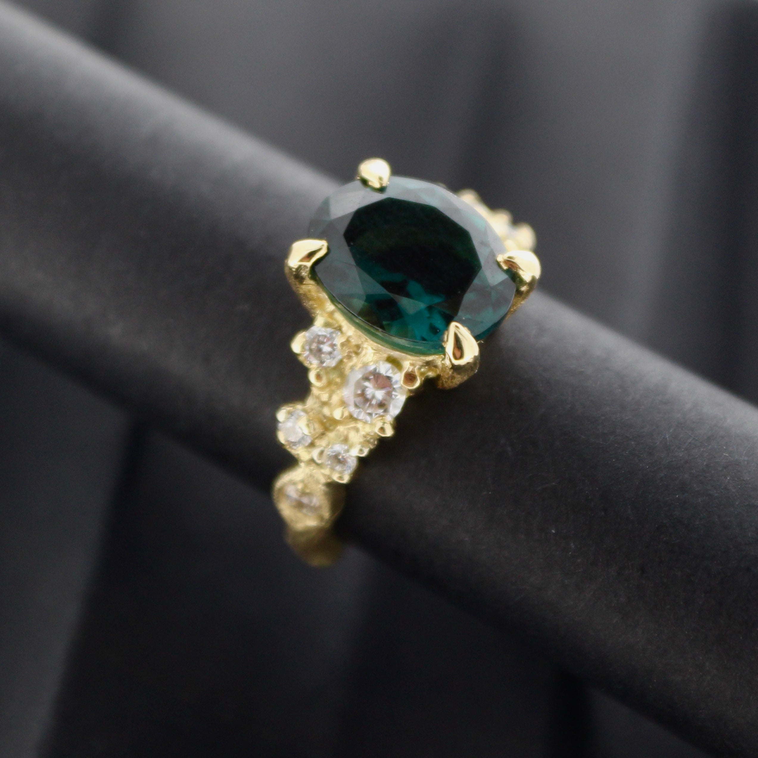 A bespoke engagement ring with green tourmaline and diamonds set in an 18ct gold band, styled on a natural wood pattern