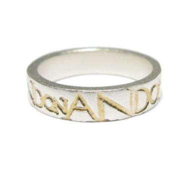 A wide silver ring with square edges, etched 'ON AND ON' in uppercase around the outside with a matt finish.