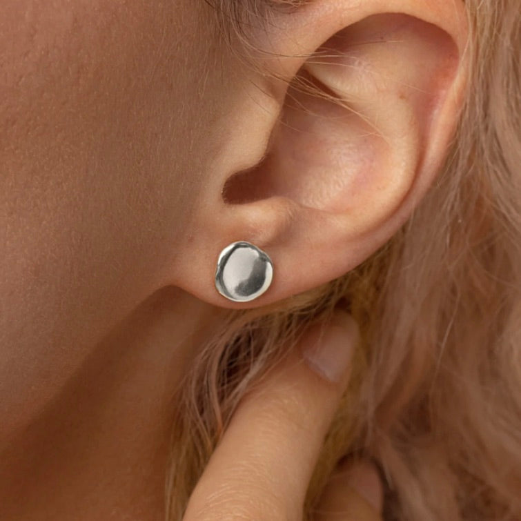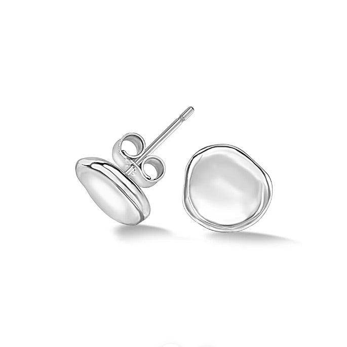 Silver. The flat pebbles have a round yet irregular shape and feature a subtle dimple. Size approx. 10 x 8mm.