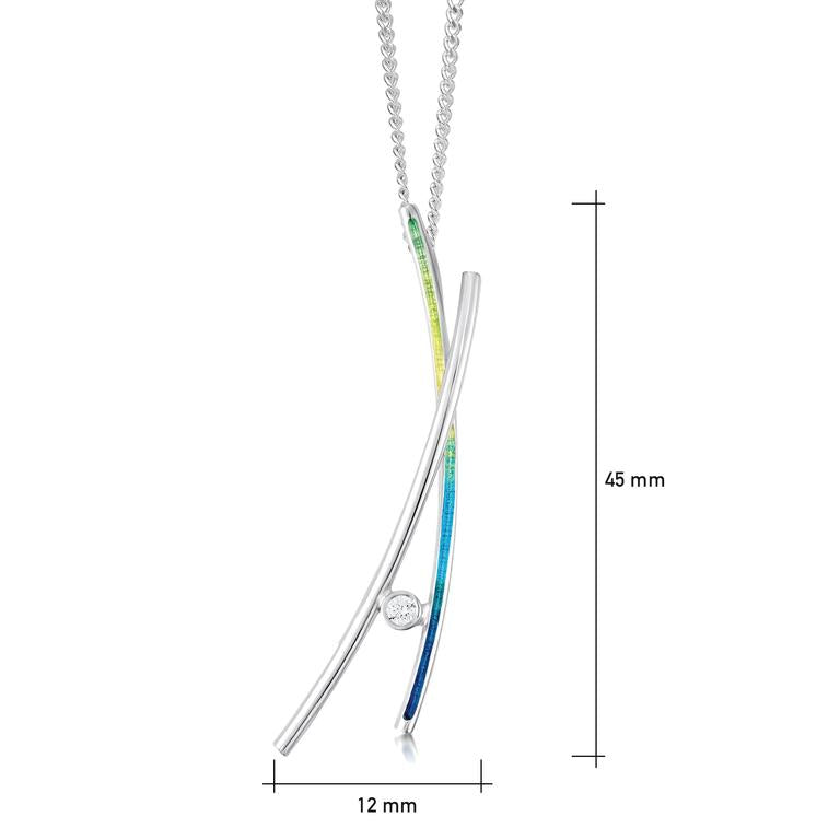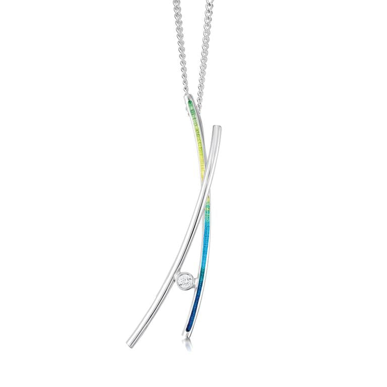 This Wild Grasses pendant necklace features two overlapping sterling silver strands, one hand-enamelled, the other in polished silver. The design is enamelled in 'Meadow' enamel and is enhanced with a 3mm cubic zirconia set by hand. The pendant hangs elegantly from a sterling silver curb chain.