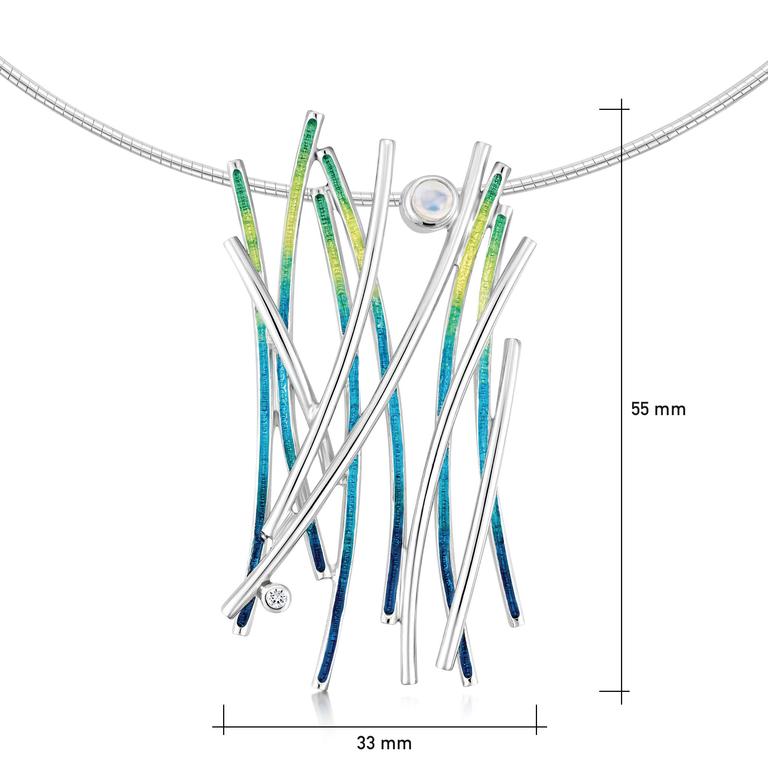This Wild Grasses occasion necklace in sterling silver features six hand-enamelled strands overlaid with five polished silver strands. The design is enhanced with a 4mm moonstone and 2mm cubic zirconia set by hand, and elegantly hangs from a sterling silver neckwire. This design is enamelled in 'Meadow' enamel.